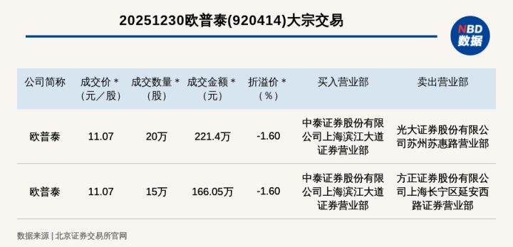 每经讯,2025年12月30日,北交所上市公司欧普泰(920414,收盘价:11.25元)发生2笔大宗交易,总成交金额为387.45万元,成交金额最高的一笔成交价11.07元/股,成交数量20万股,成交金额221.4万元,折价1.6%。买入营业部是中泰证券股份有限公司上海滨江大道证券营业部,卖出营业部是光大证券股份有限公司苏州苏惠路营业部。