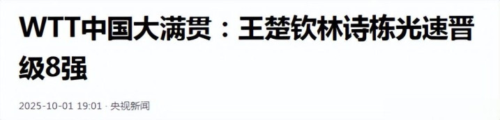 央视新闻《WTT中国大满贯:王楚钦林诗栋光速晋级8强》发布时间:2025.10.1