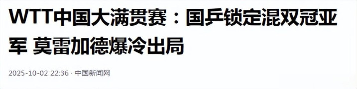中国新闻网《WTT中国大满贯赛:国乒锁定混双冠亚军 莫雷加德爆冷出局》发布时间:2025.10.2