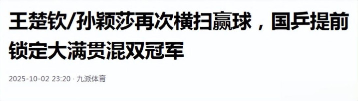 九派体育《王楚钦/孙颖莎再次横扫赢球,国乒提前锁定大满贯混双冠军》发布时间:2025.10.2